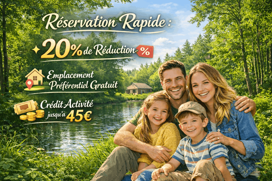 Réservez votre séjour au moins 4 mois à l’avance et bénéficiez d’une Réduction Réservation Rapide de 20%, ainsi que d’un emplacement préférentiel offert pour votre cottage. Et ce n’est pas tout ! Nous avons une nouvelle surprise pour vous : bénéficiez d'un Crédit Activité jusqu'à 45€ !